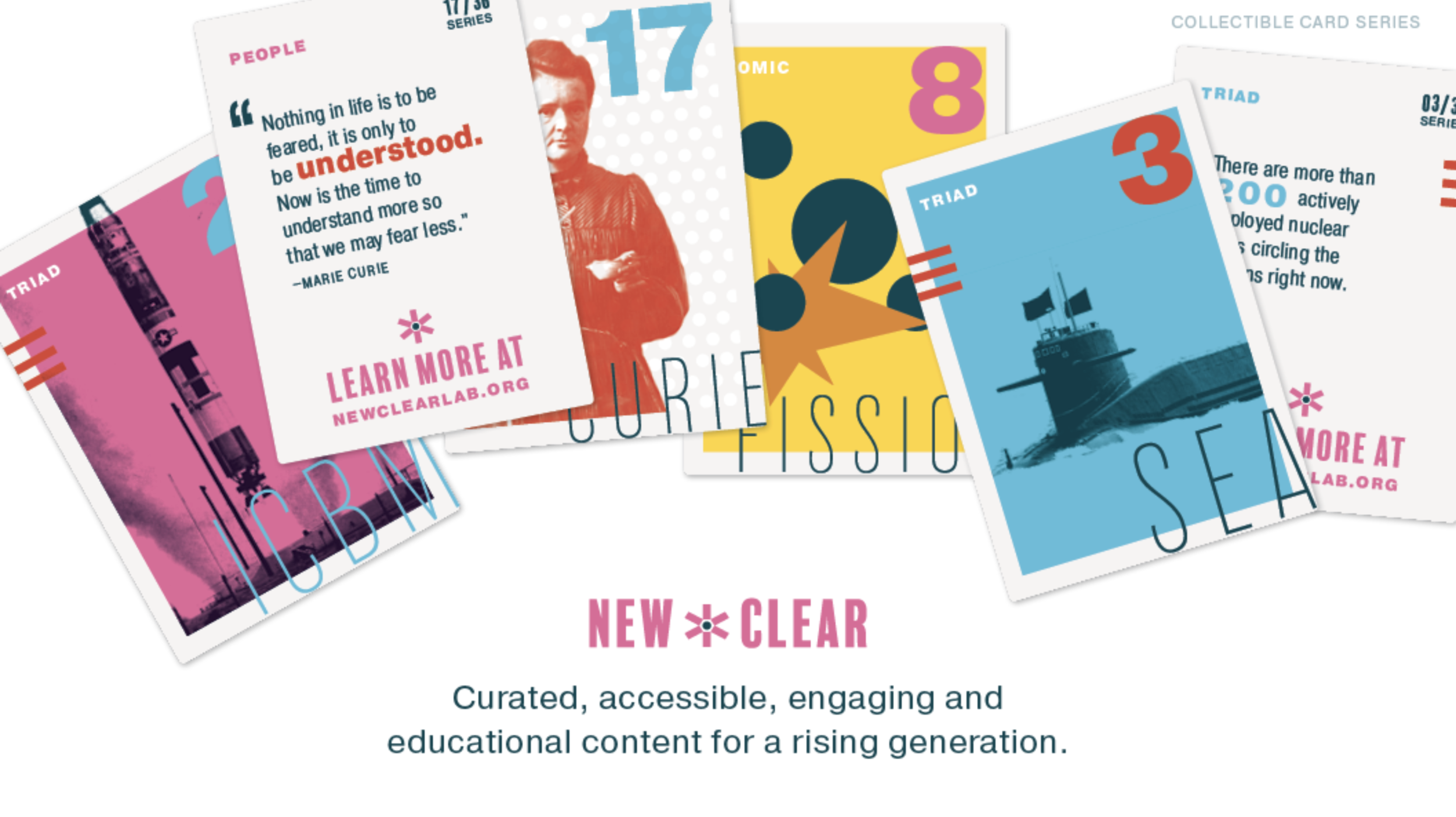 I worked with nuclear experts from NSquare’s Innovator’s Network to develop a unique engagement platform that introduces students, parents, and educators to nuclear topics like nonproliferation, disarmament, and arms control. NEW+CLEAR gives young people agency over what they learn and how they learn. It enables them to explore nuclear issues in their own way, whether through art, poetry, or science. Once on the platform, they can design their own experience, choosing from a range of immersive, hands-on educational opportunities (like activity boxes) or following links to learn more about internships and fellowships.